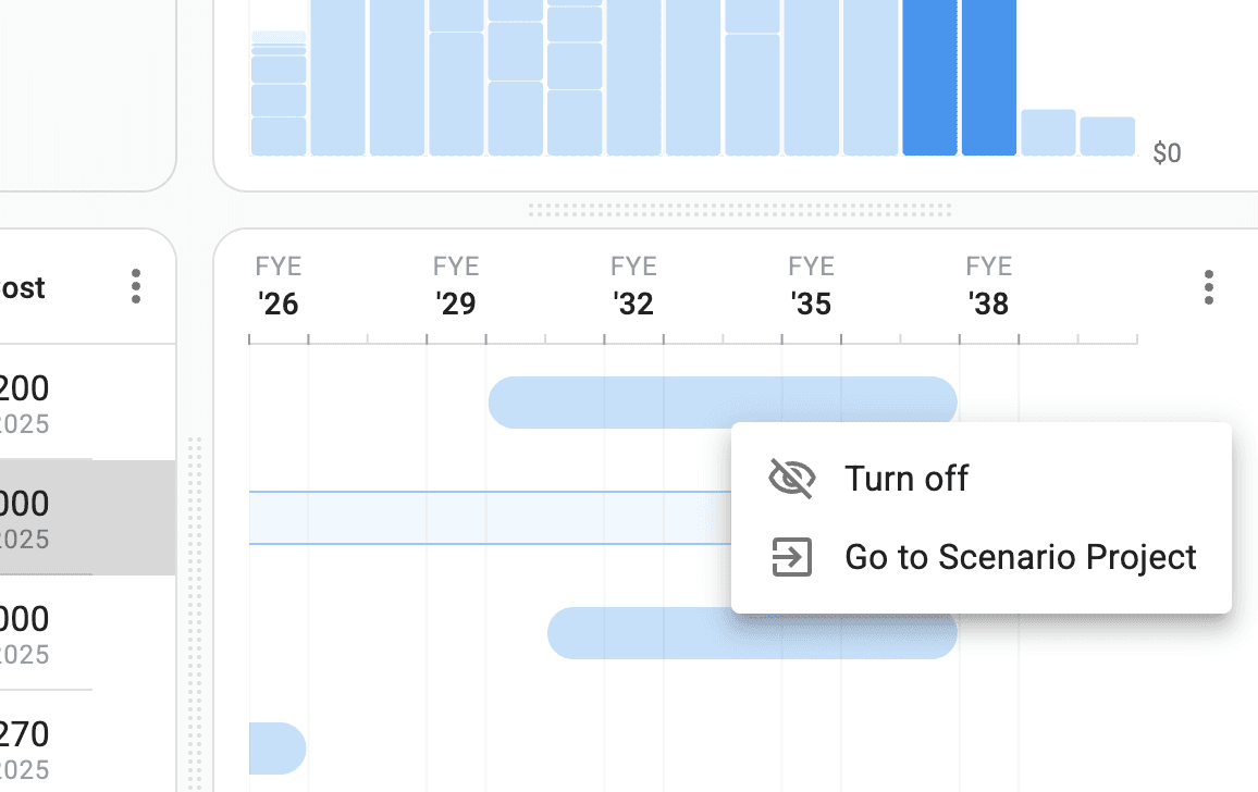 Filtering & Segmentation (Left): Introduced keyword search, dynamic filters (e.g., by cost, utility type, timeline), and integrated the driver donut into a streamlined filter menu. Users can also sort projects by any column using a custom column configuration tool, enabling more focused and efficient scenario planning.