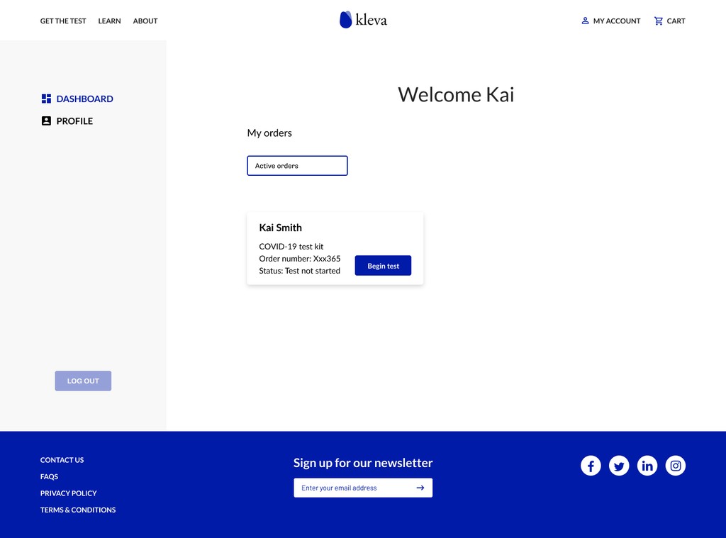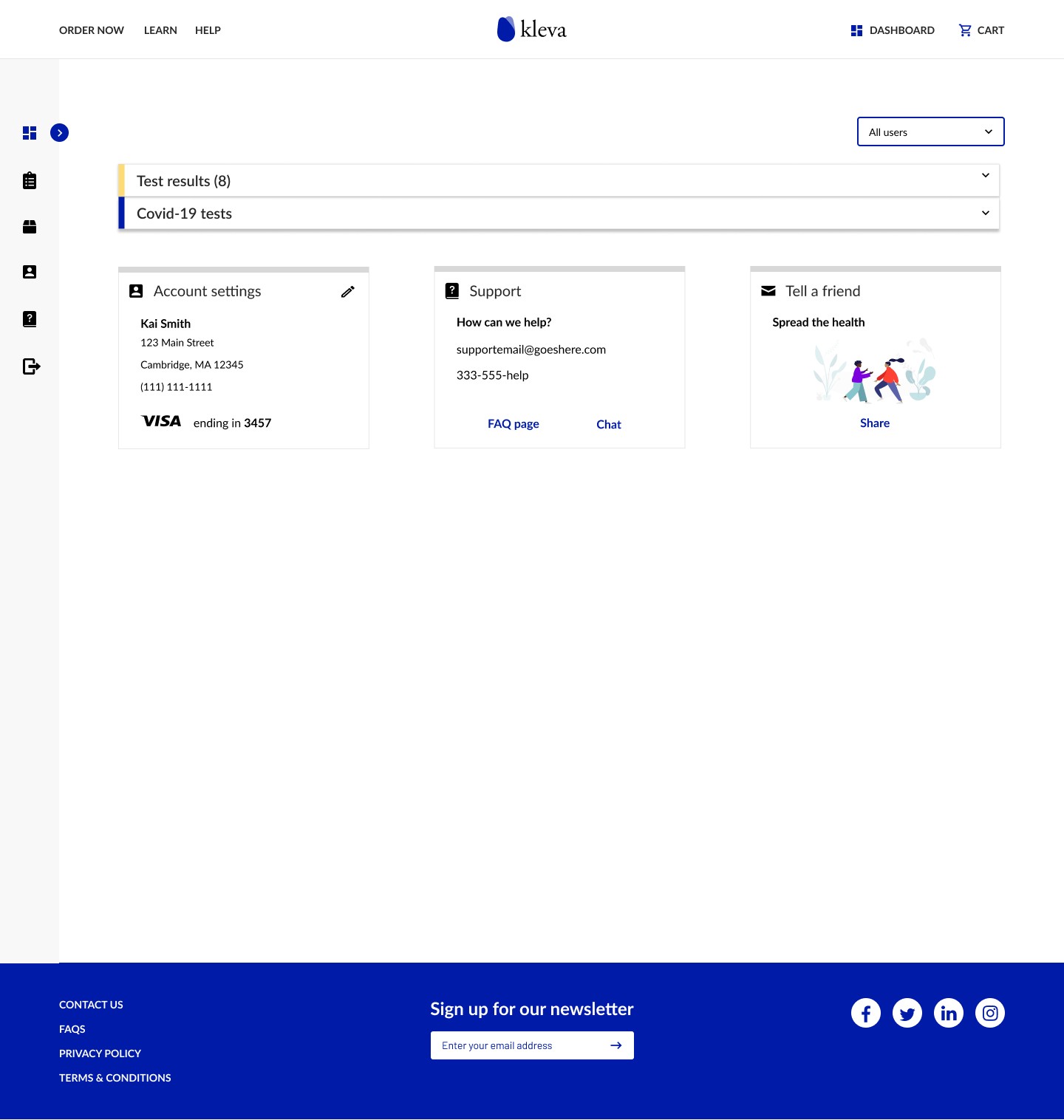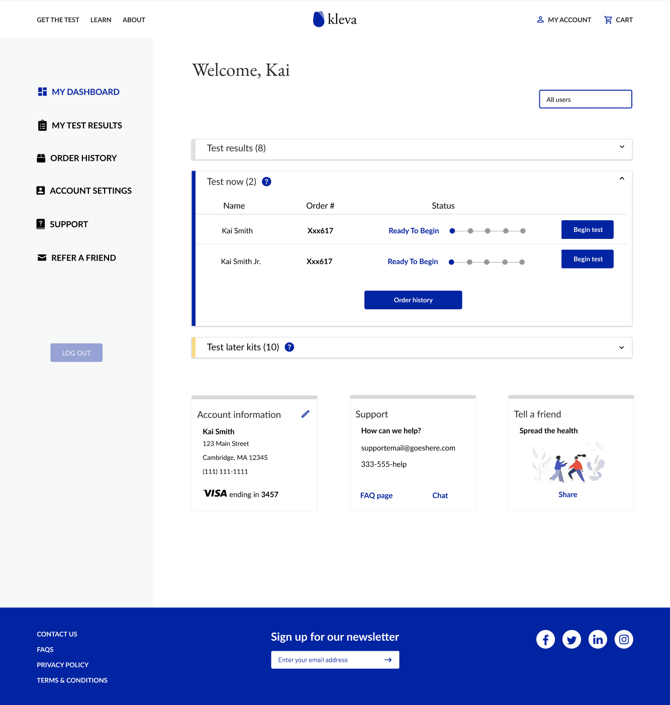 Kleva Health Dashboard Redesign: Kleva Health was a digital-health startup who launched an FDA-approved at-home COVID-19 test. When this project began, their existing site didn’t support purchases, and the post-purchase dashboard was virtually empty. Over four weeks, I led a full redesign—taking existing Figma screens, refining them into a cohesive prototype, and guiding the product from wireframes through usability testing to final hand-off.