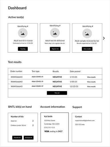 Wireframes & feedback: Initial sketches separated “Active Tests” and “Kits on Hand,” then incorporated design-lead requests for increased whitespace and updated typography.